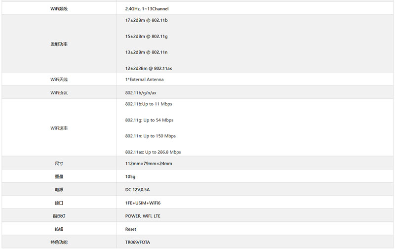 规格: 1*FE(RJ45)+USIM+WiFi6