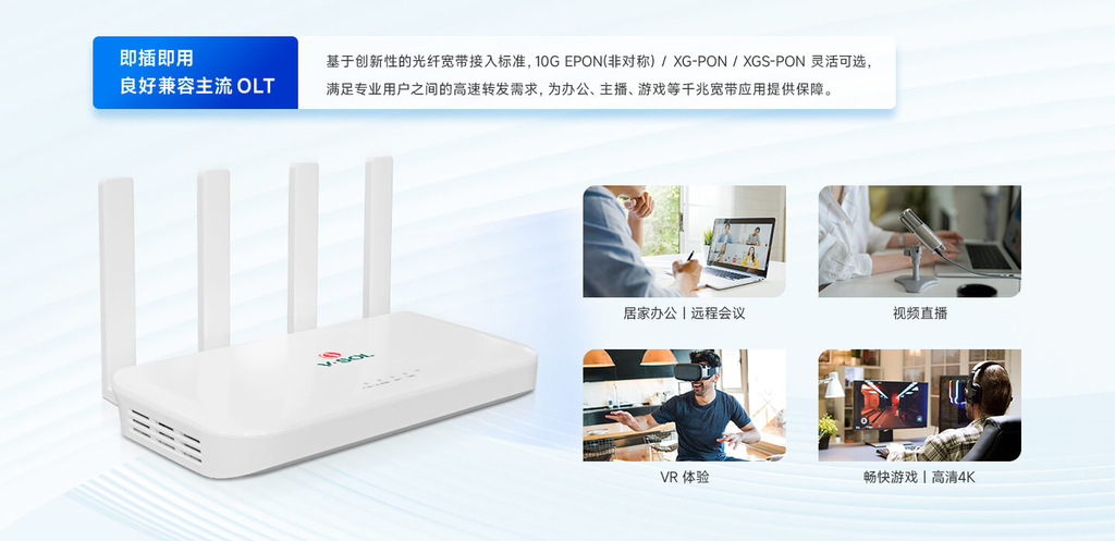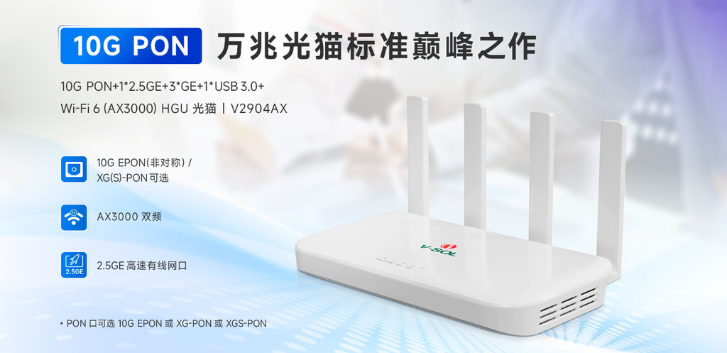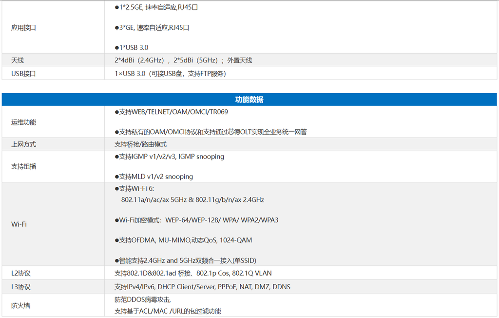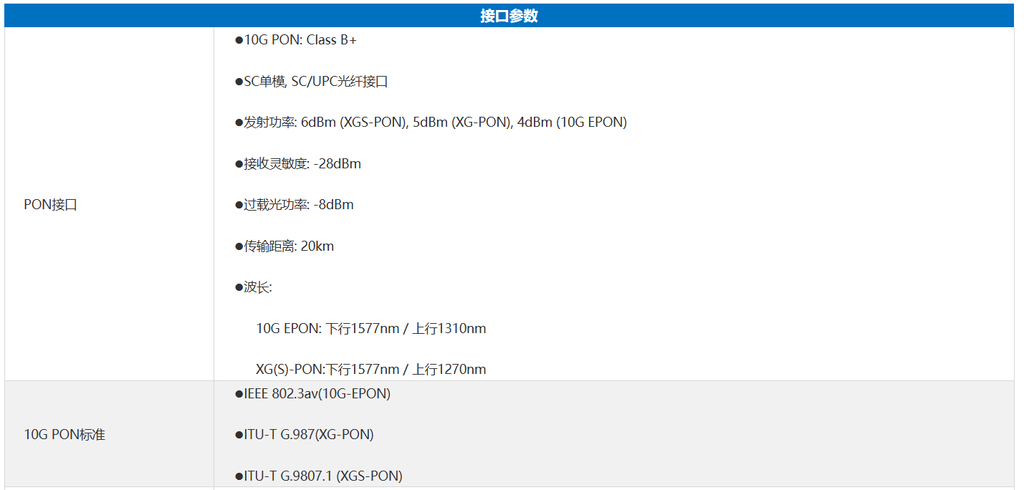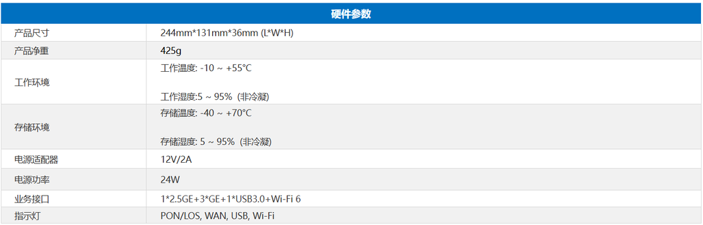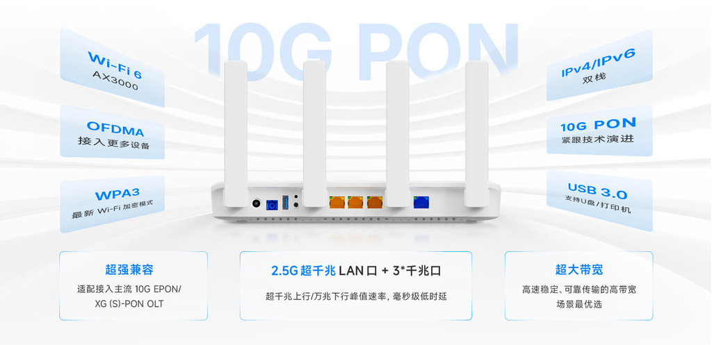 规格:1*2.5GE+3*GE+USB3.0+Wi-Fi6(AX3000),10G EPON/XG-PON/XGS-PON