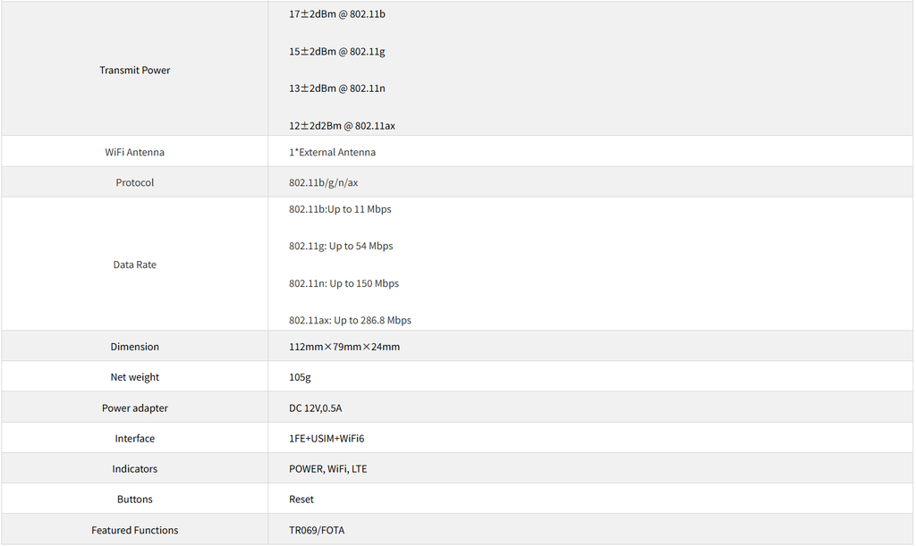 Spec: 1*FE(RJ45)+USIM+WiFi6