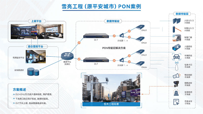 通过凤凰科技PON传输解决方案,配套专为雪亮工程开发的光纤宽带的隧道协议VPN功能,通过简单配置,即可将原有公共视频子系统接入中心平台,实现基层数据采集。